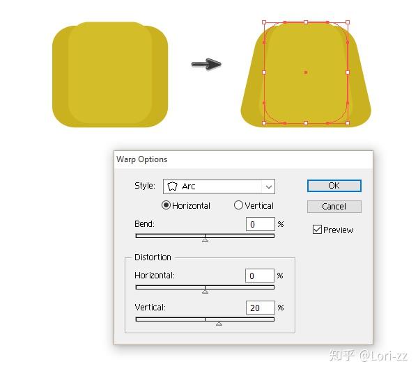 选中一个矩形,然后使用效果>变形>弧形,按照下面对话框设置。两个矩形都有同样的设置参数。扩展这个形状,对象>扩展外观。