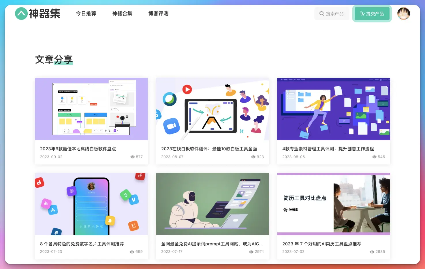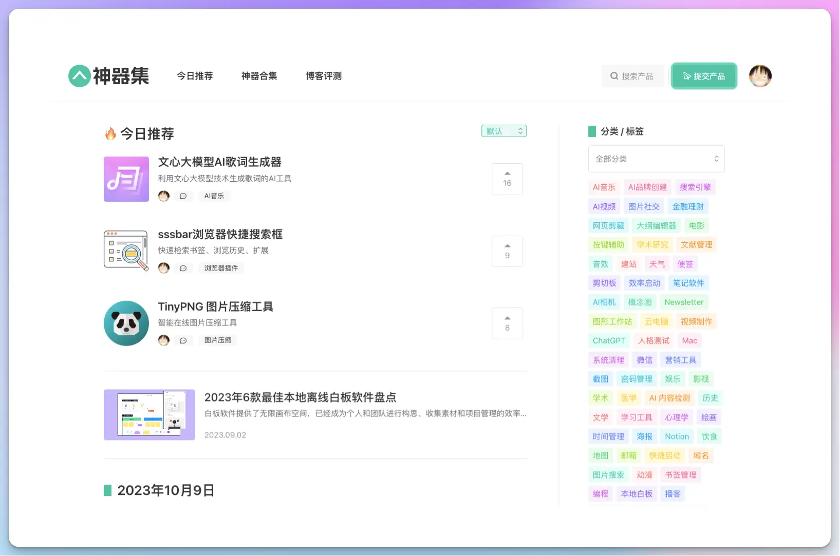 产品推荐:每天收录多款有趣、实用产品。神器合集:精选了多个类别的优秀产品榜单,主要以产品的投票数进行排行。博客评测:针对优秀软件产品提供了详细的博客评测,为用户提供工具选择建议和解决方案。